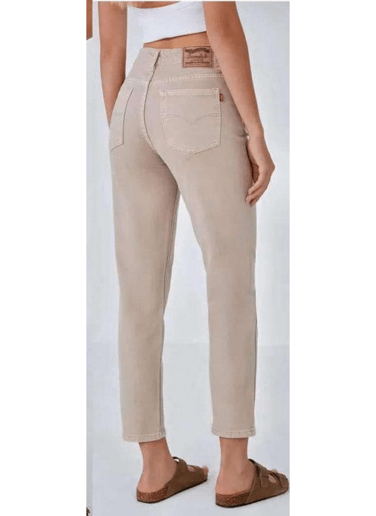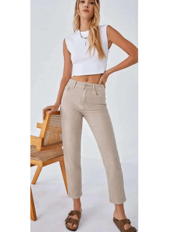Beige jeans broek met elastaan, mom fit model, hoge taille, maat valt normaal